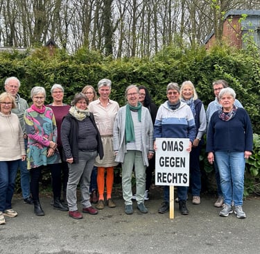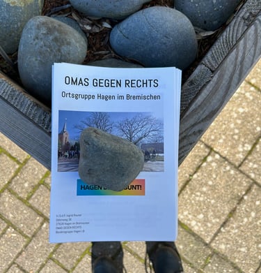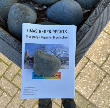 Wir sind eine Gruppe engagierter Omas, Opas & Nicht-Omas in der Gemeinde Hagen im Bremischen, die für Demokratie, Menschenrechte und Vielfalt kämpfen und gegen Hass und Hetze eintreten. Gemeinsam setzen wir uns für eine bessere Welt ein. Wir treffen uns regelmäßig jeden 2. Donnerstag im Monat in der Engelsbäckerei in Bramstedt, im Bocksacker 9, sowie jeden letzten Donnerstag im Monat im NestWerk in Hagen (1. Etage über dem Bürgermarkt). Beginn ist jeweils um 16:00 Uhr.