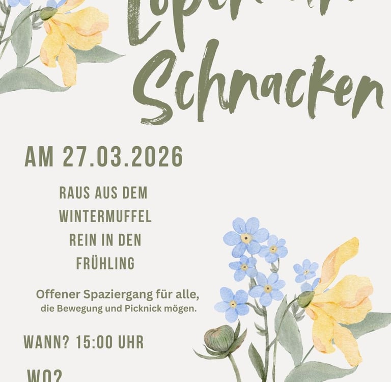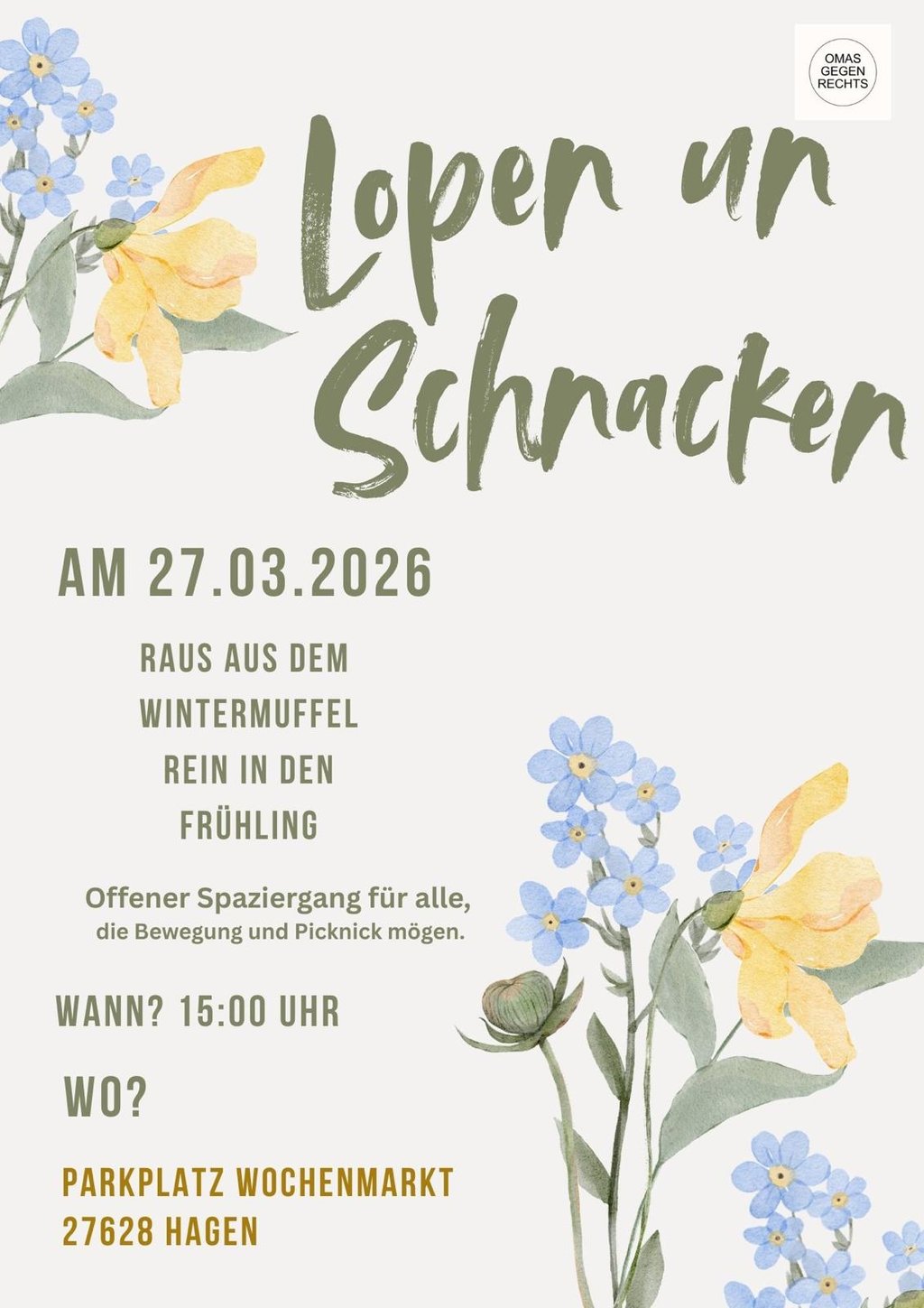 "Lopen un Schnacken" die 1.! - Bei wunderbarem Wetter haben wir uns zum ersten Mal gemeinsam auf den Weg gemacht. Nach einer Wanderung durchs Hagener Königsmoor rasteten wir an der Bank im Moor und ließen uns allerlei Leckereien schmecken (inklusive Grog!) Wir werden das wiederholen, die Termine werden rechtzeitig bekannt gegeben!